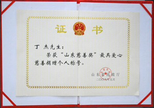 ·2009年,丁杰董事長(zhǎng)獲得“山東慈善獎(jiǎng)”最具愛(ài)心慈善捐贈(zèng)個(gè)人稱號(hào)