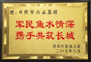 ·2009年8月,鐵軍獨(dú)立團(tuán)贈(zèng)日照興業(yè)集團(tuán)有限公司:軍民魚(yú)水情、攜手共筑長(zhǎng)城