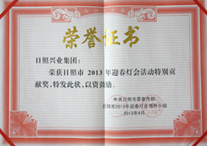 2013年4月,興業(yè)集團(tuán)榮獲“日照市2013年迎春燈會(huì)活動(dòng)特別貢獻(xiàn)獎(jiǎng)”