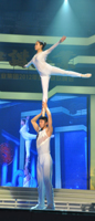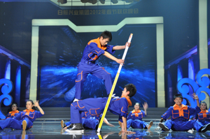 STAR》,引起全場雷動歡呼;同德礦業(yè)公司選送的雜技《肩上芭蕾》驚險刺激,來自北京雜技團的年輕演員們在同伴肩膀上邁起輕盈的舞步,場下觀眾驚呼不已,拍手叫絕;臨汾志強鋼鐵公司的漢子們表演的威風(fēng)鑼鼓《堯天舜日》高亢激昂,令觀眾們心潮澎湃,更激發(fā)了大家開創(chuàng)美好未來的激情和斗志。